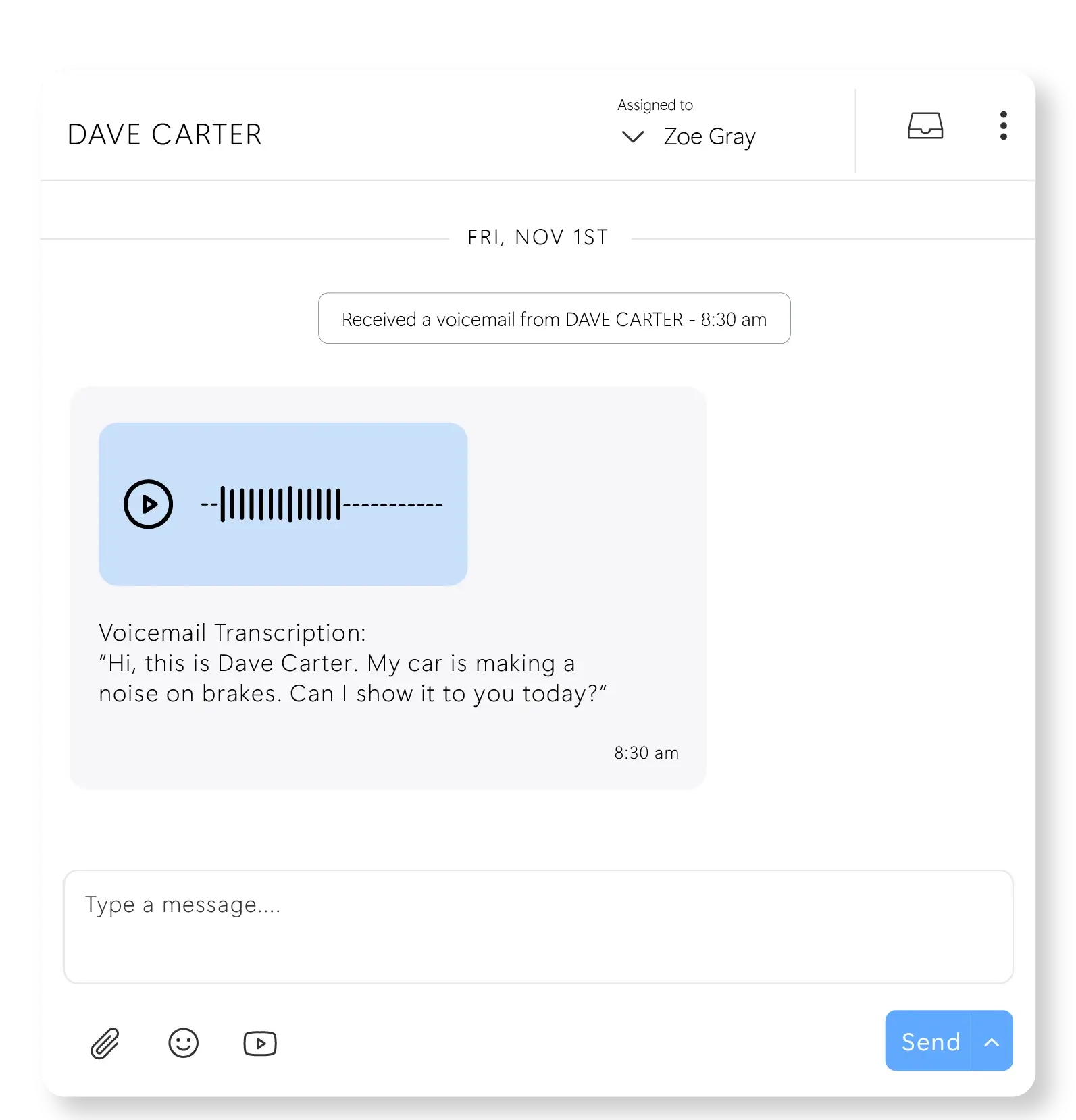 It means when someone calls your business’s text line and leaves a voicemail, you’ll see it as an audio clip inside your DemandHub chats.